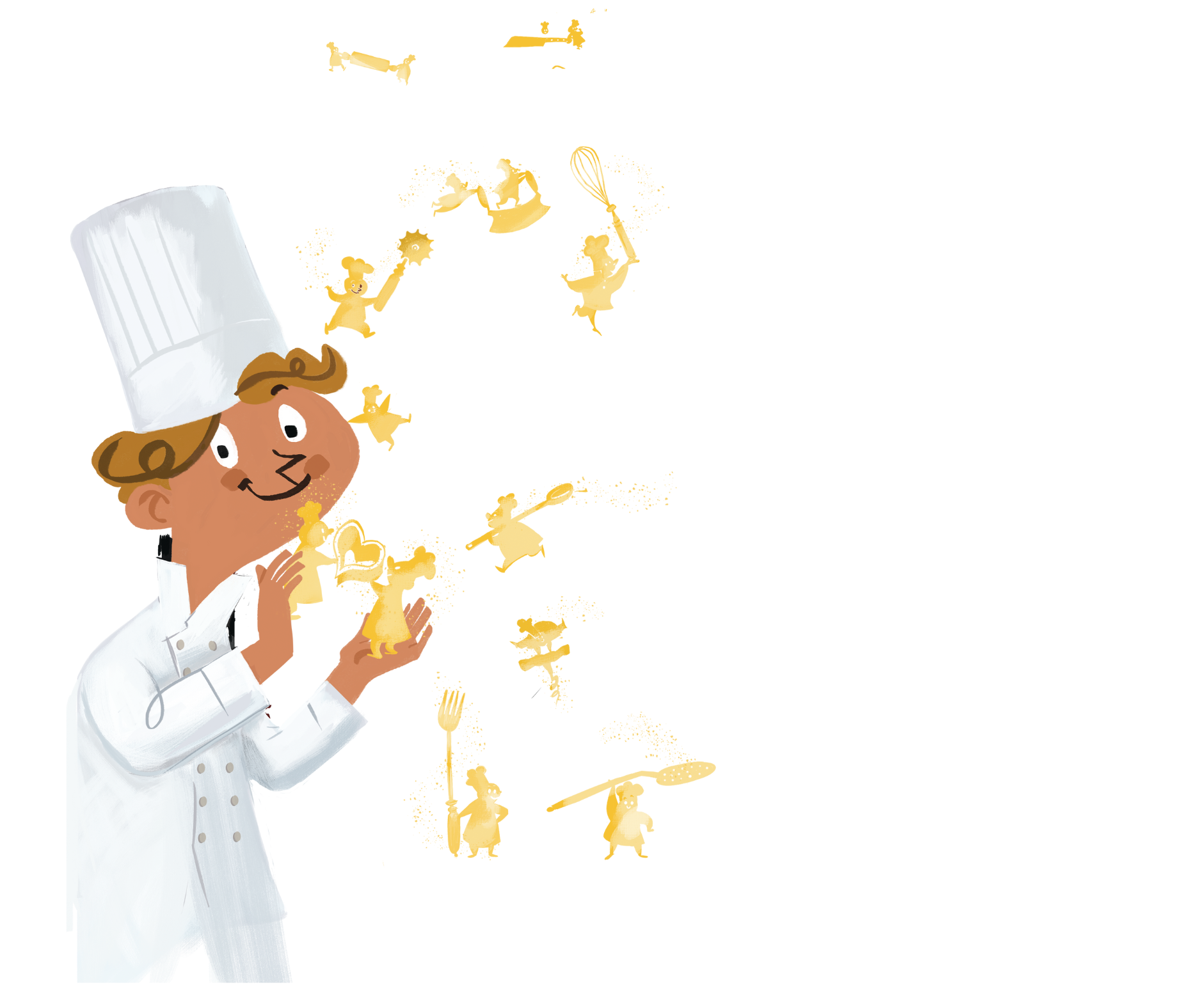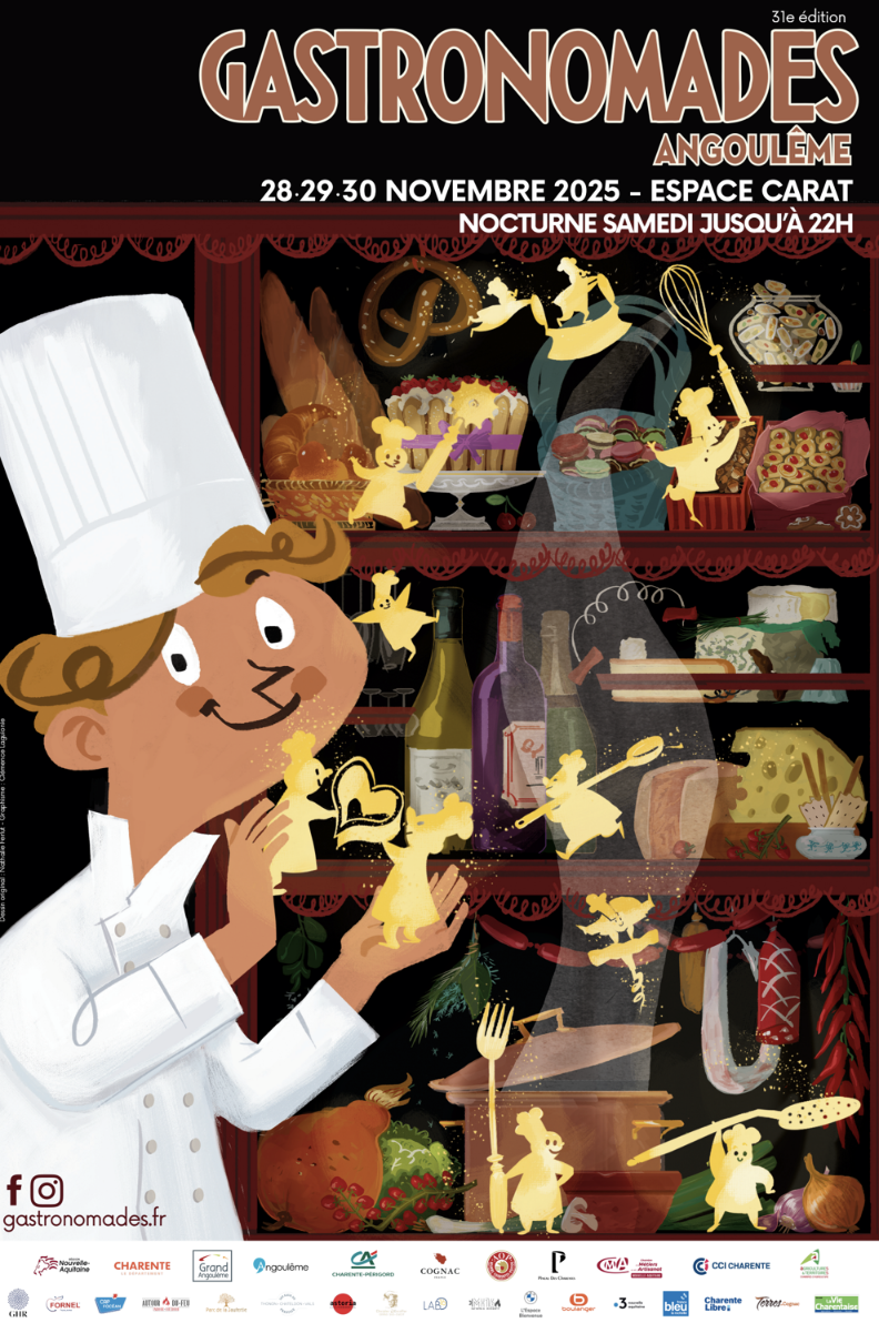Son affiche met en scène un chef entouré de petites silhouettes dansantes, des personnages espiègles qui s’animent parmi les produits gourmands, les bouteilles et les ustensiles.